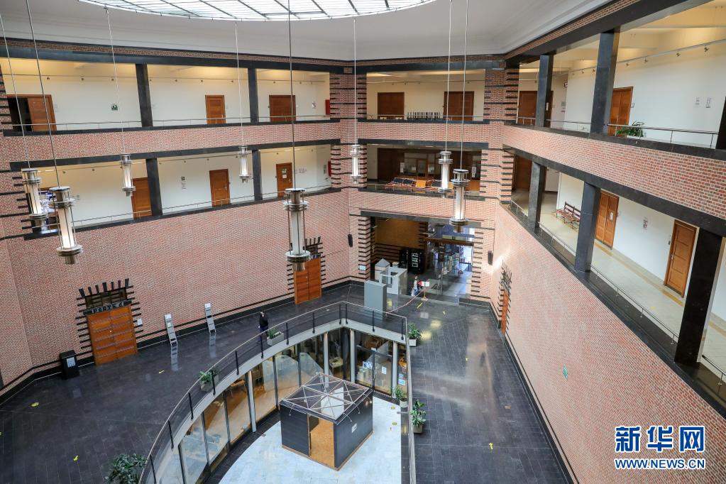 这是4月20日在比利时南部城市沙勒罗瓦拍摄的沙勒罗瓦劳动大学图书馆。新华社记者 郑焕松 摄